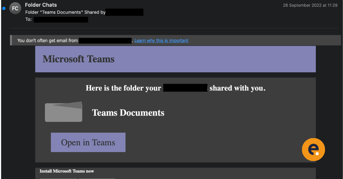 The emails sent out by the Threat Actor (TA) contained a basic looking phish. The emails we have observed during the campaign within our customer base contained emails about shared teams folders ‘Folder “Teams Documents” Shared by *company name*’. The email body was completely base64 encoded and contained a link behind a button.